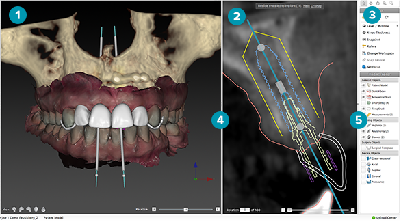 The 3D viewer shows a general overview of the 3D scene which consists of DICOM data merged with the dental scan. in the 2D viewer, the user sees a radiographic cross-section view of this data.