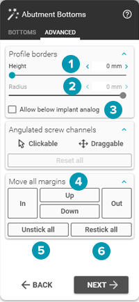 If you are designing a multi-unit restoration, all abutment bottoms will be adapted simultaneously. To remove material from/add material to one abutment bottom, select the abutment, activate expert mode and in the dock select Generate abutment bottoms.